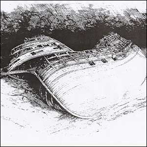 This picture shows an artist's impression of Henry VIII's flagship, with bowcastle intact, approximately 50 years after she sank.