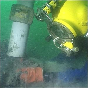 One of the team's divers vacuums up silt with the airlift to expose the timbers below.
