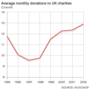 ![]() | Charity fears When the National Lottery began in 1994, fears were raised that public donations to charities would tumble. Early figures seemed to bear out those worries. The National Council for Voluntary Organisations believes the Lottery is one of a number of reasons for the temporary drop, but says gambling is not an efficient way of giving to charity anyway. |
