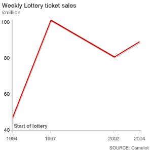 ![]() | Camelot's lot Camelot is a private company set up to operate the Lottery and maximise returns for the so-called Good Causes. It is not responsible for distributing the funds. Its annual profits are restricted by its licence to 0.5% of ticket sales, which have recently begun rising again after a worrying dip either side of the new Millennium. |