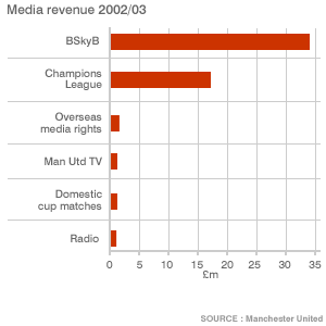 ![]() | Broadcast Television, and in particular BSkyB, has revolutionised the way most people watch live football. BSkyB has pumped millions of pounds into the sport. As well as a lucrative share of the rights from BSkyB, United makes millions of pounds from coverage of the European Champions League. |