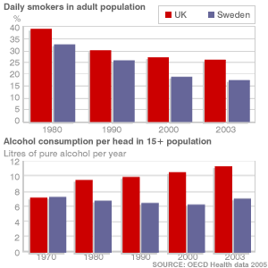 ![]() | Smoking and boozing While Sweden does have its own problems with smoking and drinking, the problem is less acute than in the UK. Drinking, in particular, has not rocketed in the same way. Smoking is mostly concentrated in the younger age groups. Officials want to get the smoking rate below 10% in coming years. |