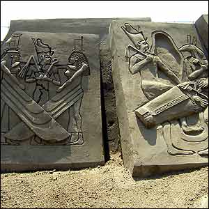 The tools of the trade include cement trowels, straws and paintbrushes, and palette knives for the more detailed work such as hieroglyphics