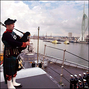 A piper plays as the former flagship of the Royal Navy HMS Invincible sails into Portsmouth on Monday for the last time before it is decommissioned.