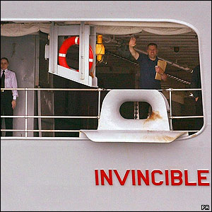 A crew member waves a final farewell as the aircraft carrier sails into Portsmouth.