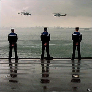 Two Lynx helicopters perform a flypast as Invincible sails into Portsmouth harbour.