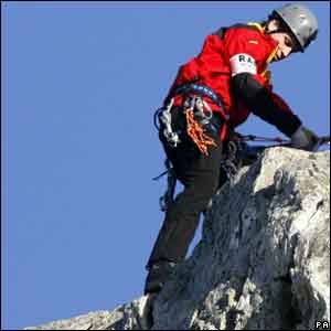 The prince's first task was abseiling down the rock with a stretcher in a mock rescue.