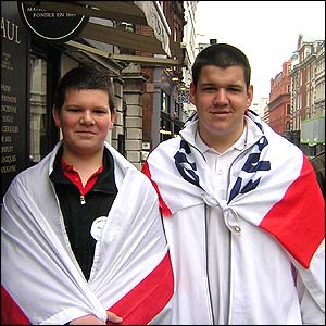 ![]() | Quiet day Teenagers James and Daniel turned out decked in the English flag to take part in the celebrations. They said they were disappointed by the events. Despite it being only midday when they spoke to BBC News the patriotic pair said they were considering going home. "We didn't realise how quiet it was going to be," they said. |