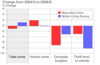 Recorded crime fell 1% in the past year to 5.56m, while the British Crime Survey figure, based on people's experience of crime, rose 1%.