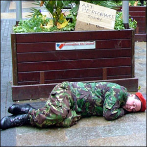 ![]() | Street artist An endurance artist is lying down in the middle of a Birmingham street dressed as a soldier to highlight the subject of conflict. Mark McGowan has been given �4,000 of public money for Dead Soldier which will see him curled up on New Street for the next seven days. BBC News Online's Caroline Gall went to see what the public thought. |