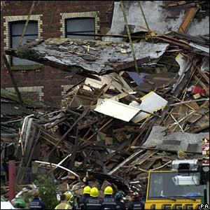 ![]() | Mountain of debris Pieces of the fallen factory roof were lifted off by crane to allow rescue teams to attempt to reach those still trapped underneath. They hoped people in the collapsed building were able to survive in pockets formed by sturdy items such as drinks machines or filing cabinets. |