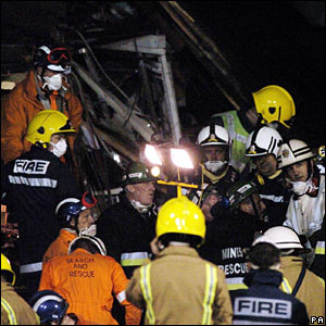 ![]() | Through the night Emergency service personnel worked through the night in an attempt to reach factory employees unaccounted for. More than 300 firefighters, medics and police took part in a 72-hour search for survivors. |