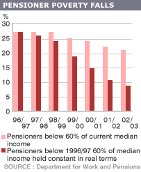 | Labour's pension credit, formerly the minimum income guarantee, should ensure UK pensioners receive �109.45 a week. The credit is a means-tested benefit. Pensioners who qualify for its main element should also get help with council tax and housing costs. It is paid to 2.65 million households, but many pensioners in need are failing to claim. Opposition parties have pledged to reduce means-testing of pensioners as they say it is demeaning and discourages saving.