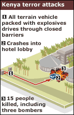 The others remained in the car as it exploded, shattering windows and setting buildings on fire. Popular destination If confirmed as the work of al-Qaeda, it would be their first direct attack on Israelis - despite Bin Laden's hostility towards Israel. Mombasa, on Kenya's Indian Ocean coast, is a popular destination for foreign visitors and the hotel was frequented mainly by Israeli tourists. In 1998, the US embassies in Kenya and neighbouring Tanzania were attacked in nearly simultaneous car bombings that killed 219 people and 12 people respectively. The US blamed al-Qaeda. Co-ordinated, synchronised attacks are a hallmark of al-Qaeda, and the BBC's security correspondent Frank Gardner says months of careful surveillance clearly went into the latest Kenya attacks. |