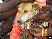 An Indian man has "married" a female dog, hoping the move will help atone for stoning two other dogs to death. P Selvakumar, 33, said he had been cursed since the killings, suffering paralysis and a loss of hearing.