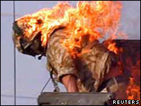 Sgt Long, 29, told the BBC: "My back was on fire, down the back of my arms and part of my face. It was basic panic, I needed to get out of (the vehicle's) turret and get the flames put out." He said after checking that his colleague was being dealt with, he got back into the vehicle to deal with the public disorder.