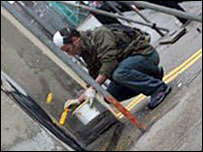 The photographer, who wishes to remain anonymous, is familiar with Banksy's work and took the shot as she was passing the artist at work.