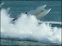 West Country powerboat racer Chris Parsonage has told of his lucky escape after nearly flipping his 42ft (13m) catamaran over at 140mph (225kph). Parsonage, from Liskeard in Cornwall, and New Zealand co-driver Peter McGrath were on the first lap of the Class 1 Grand Prix in Doha, Qatar.