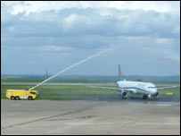 Click on the picture to see why this plane was greeted by water on Thursday