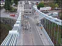 | A bird's eye view from the bridge - from a maintenance platform above the Menai Straits.