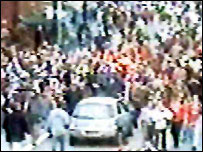But a number of cars were seen trying to drive along roads, which had been closed to traffic but which were being used by thousands of people making their way to the stadium.