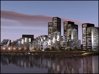 The developer hopes to build 10 buildings containing 2,400 apartments along the Bay and Ely river shoreline.