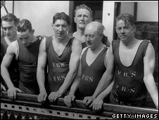 | Cardiff City players in 1927 took salt water baths during their pre-match break
