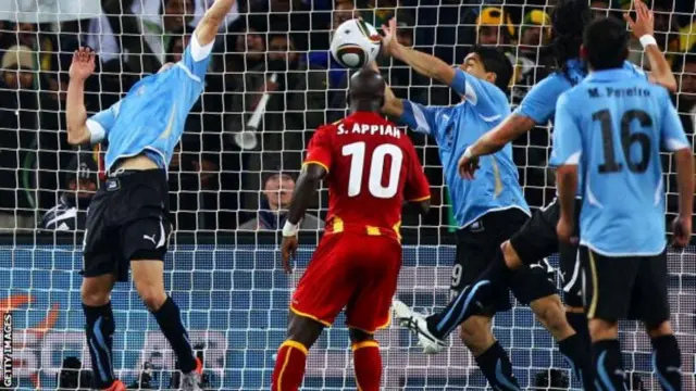 Suwaareez kubbaa Gaanaan goolii taateetti jedhamte sararrraa harkaan rukkutee baase. Suwaareez taphataa jifataadha malee kan karra eegu miti; garuu harkumaan dhahee kubbaa galteetti jedhamte sararraa baase.