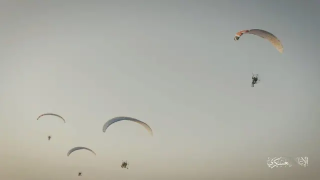 Viidiyoon miidiyaa ajaja waraanaa 'Izz al-Din al-Qassam Brigades' irratti ba'e wayita paaraashuutiin kunneen loltuu tokko yookiin loltoota lama qabatanii lafarraa ka'uun gara Israa'el qajeelan mul'iseera.