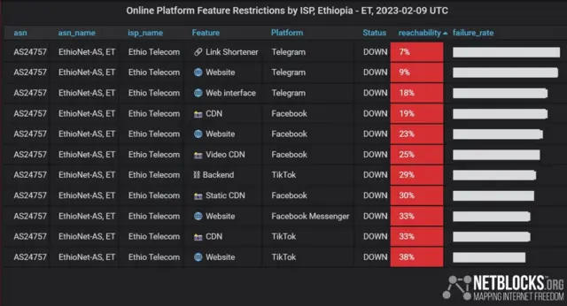 Netblocks akka jedhetti, appiiwwan oliitti eraman kanneen irra dhorkaan kan kaa’ame dhaabbata dhiyeessaa tajaajila intarneetii mootummaan bulfamu karaa Itiyoo-telcomiitiin.