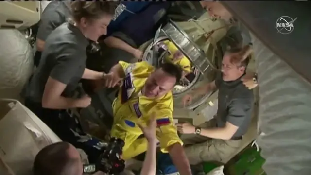 Qorattoonni hawaa Raashiyaa sadan- Oleeg Artemyeev, Deeniis Maatveev fi Sergeey Korsaakoov erga balaliinsii sadii-afur dhaabbata Raashiyaa kan Kaazaakhstaan jiruu irraa fashalaa'een booda nagumaan buufata hawaa qaqqaban.