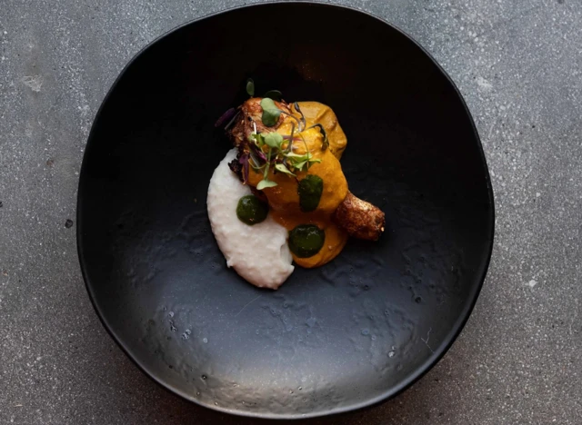 L'ingéniosité de l'igname se poursuit au Chishuru de Londres, où la chef Adejoké Bakare, première femme noire du Royaume-Uni à obtenir une étoile Michelin, a servi sa version de l'àsáró, une potée yoruba d'igname douce mijotée et écrasée dans une réduction de tomates épicées et de poivrons rouges, servie avec de l'anguille fumée et du brocoli violet en germe.