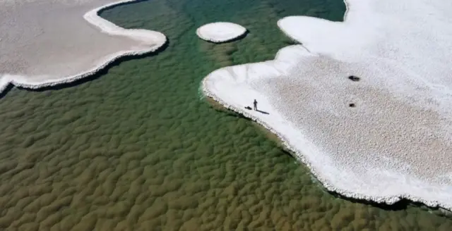 Ils décidèrent de visiter ce plateau inhospitalier situé à près de 4 500 mètres d'altitude et y trouvèrent une douzaine de lagons aux eaux claires et extrêmement salées dont les fonds étaient recouverts de monticules verts de stromatolites.