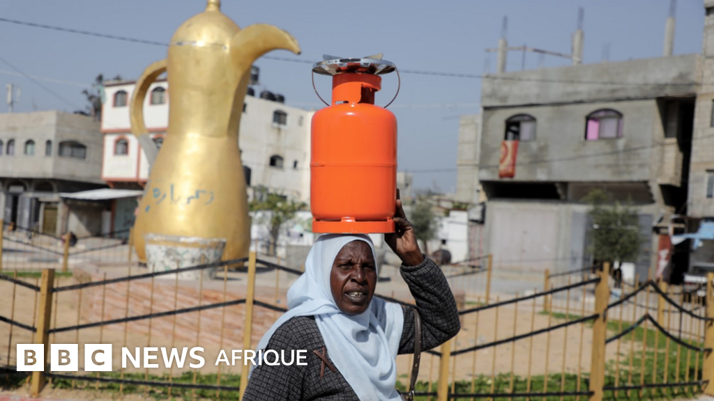 Une femme porte une bouteille de gaz sur la tête, dans la bande de Gaza.
