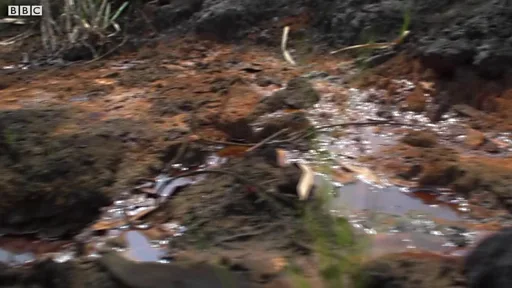 Il y a des flaques de pétrole sur le sol, avec des troncs d'arbres noirs et brûlés qui en sortent. La terre est tellement carbonisée qu'on dirait la scène d'une éruption volcanique.