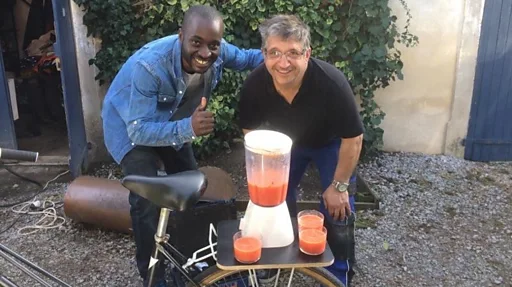 Pédaler, mixer, déguster. Hervé Nguetsop s'est inspiré d'un concept venu des Etats-Unis pour créer un prototype français qui produit du jus de fruits frais en 30 secondes.
