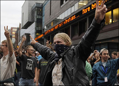 Jashtë qendrës ku mbahej konventa, protestues kundër luftës dhe kundër varfërisë zhvilluan një marshim proteste. | ||||||||||||||||||||||||