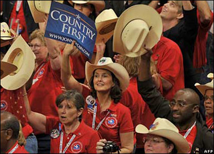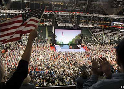 Republikanët bashkohen në mbështetje të kandidatit të tyre për president John McCain dhe partneres së tij në këtë fushatë, Sarah Palin, gjatë konventës në Shën Pal, Minesota.