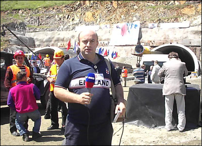 Korrespondenti i BBC-së Jonuz Hallaçi duke përgatitur një emision në daljen e tunelit në Kalimash.