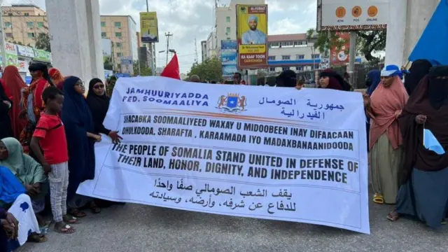 የመረጃ ሚኒስትር ዳውድ አዊስ ለቢቢሲ እንደገለጹት፣ ሰልፈኞቹ አደባባይ የወጡት “የኢትዮጵያን ኃላፊነት የጎደለው ድርጊት ለመቃወም ነው።”