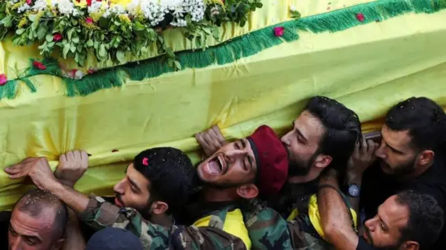 የቢቢሲ ባልደረቦች በደቡባዊ ቤይሩት ዳሂያ ከተማ ከተገደሉት መካከል በአራቱ የቀብር ሥነ ሥርዓት ላይ በተገኙበት ወቅት ከፍተኛ ፍንዳታ ሰምተዋል።