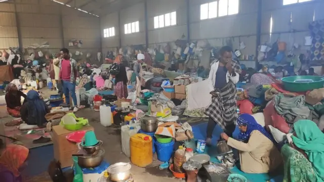 ቃላቸውን ለቢቢሲ የሰጡ በደብረ ብርሃን የሚገኙ ተፈናቃዮች ያለ በቂ የሰብዓዊ እርዳታ እና ተገንብቶ ባልተጠናቀቀ የግለሰብ ፋብሪካ ውስጥ ተጠልለው እንደሚገኙ ተናግረዋል።
