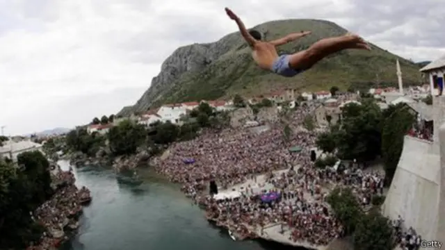 "استغرق الأمر 10 سنوات لإحياء تلك الفكرة، وفي يوليو/تموز من عام 2004، افتتح’ الجسر القديم‘ الجديد."، كما يقول كوستو. وبينما تغيّر الجسر منذ إعادة بنائه، إلا أن تقليداً متوارثاً لأجيال لا يزال باقياً: يقفز السكان المحليون من فوق الجسر إلى المياه المتجمدة في نهر نيريتفا ليتفاخروا بجرأتهم ومهاراتهم.