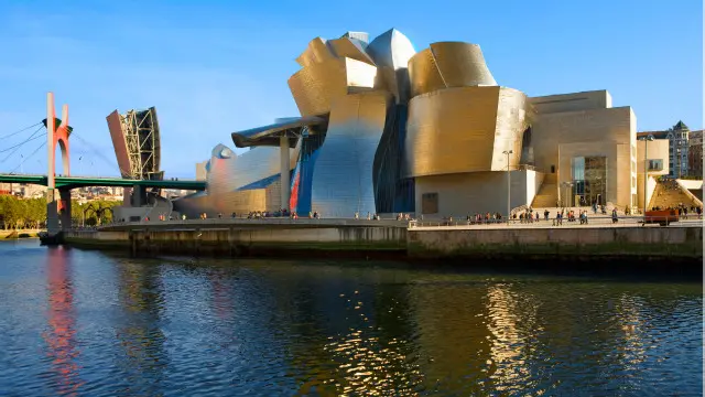 وينتصب هذا المبنى البديع على ضفاف نهر نرفيون في ما كان يُعرف بالقلب الصناعي القديم لمدينة بلباو. وتغطي هذا الصرح، المؤلف من الحجر الجيري والزجاج، حُلةٌ على شكل أمواج من معدن التيتانيوم. وفور اكتمال بنائه؛ أثار هذا المبنى صخبا وضجة، إلى حد أن المهندس المعماري فيليب جونسون، وهو أحد المعجبين بتصميمه؛ امتدحه بالقول إنه "المبنى الأعظم في عصرنا".
