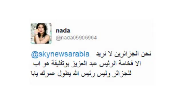 وقال محمد الرفرافي، وهو شاعر وإعلامي تونسي مقيم في باريس "بوتفليقة جاهز للتحنيط وليس للتصويت"، في حين دافعت المستخدمة ندى عن بوتفليقة قائلة "نحن الجزائريون لا نريد إلا فخامة الرئيس عبد العزيز بوتفليقة هو أب للجزائر.."