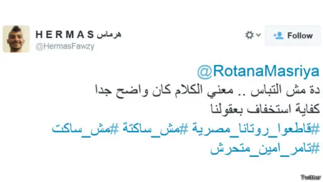 وجاء رد احد مستخدمي توتير على تصريحات القناة كالتالي: "دة مش التباس .. معني الكلام كان واضح جدا. كفاية استخفاف بعقولنا"