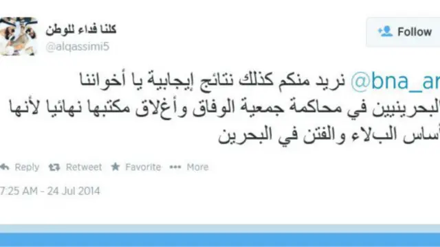 وقال المستخدم كلنا فداء للوطن على حسابه في تويتر تأييدا للطلب: "نريد منكم كذلك نتائج إيجابية يا أخواننا البحرينيين في محاكمة جمعية الوفاق وإغلاق مكتبها نهائيا ﻷنها أساس البلاء والفتن في البحرين."