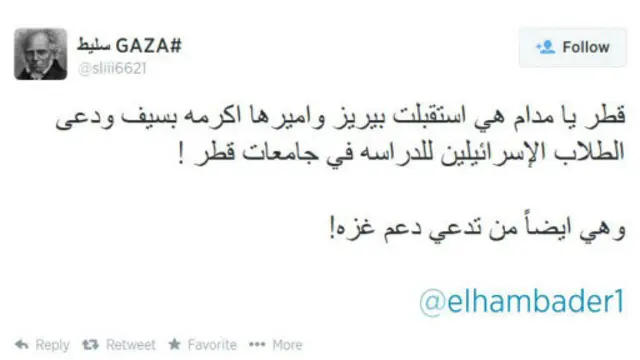 وعلق المستخدم علي الناوي مهاجما قطر: "تصريحات ليبرمان و بيريز عن دعم قطر للإرهاب ما هي إلا لعبة لتخفيف الضغط على قطر وجعل قطر تكسب تعاطف المغفلين."