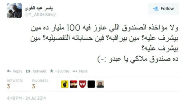وهاجم المستخدم Waleed Abdellah تصريحات السيسي بقوله: "ما هو لو فيه 100 مليار الشعب مش محتاجهم.. أومال يناير كانت "ثورة" على ديك أم أي أساس؟!"