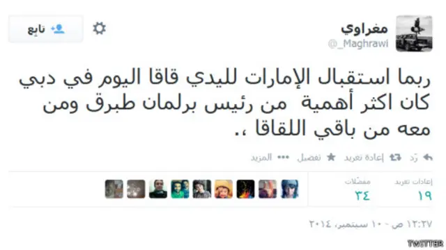 وأضاف المستخدم "مغراوي" ساخراً: "ربما استقبال الإمارات لليدي غاغا اليوم في دبي كان اكثر أهمية من رئيس برلمان طبرق ومن معه."